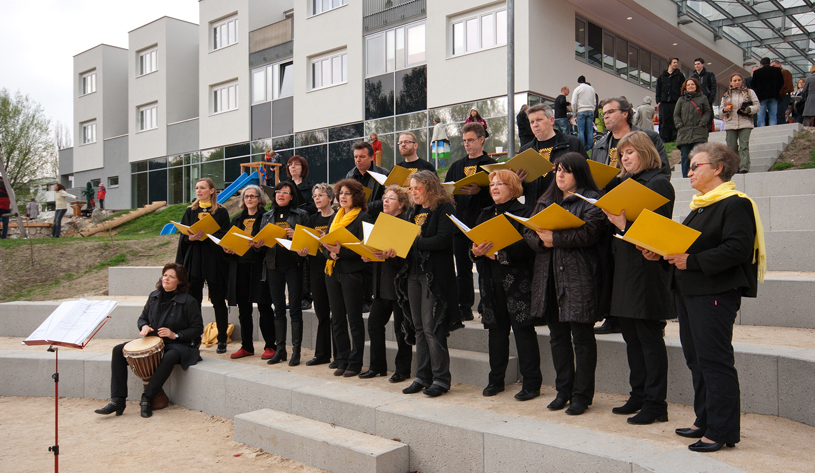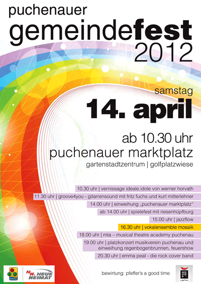 Puchenauer Gemeindefest am 14. April 2012 Die Eröffnung der Freifläche und des Spielplatzes am neuen Gartenstadtzentrum haben wir Puchenauer zum Anlass für das Gemeindefest 2012 genommen. Als erste kulturelle Darbietung auf der "Arena" beim Spielplatz erklang ein Medley, das wir speziell für diesen Anlass aus zwei Liedern unseres Konzertprogramms zusammengestellt und mit einem passenden Text versehen hatten. Danach sangen wir auf der Bühne unter dem Glasdach eine Auswahl unserer beliebtesten Lieder aus 29 Jahren MOSAIK. Eva Moherndl begleitete uns auf der Djembe. Unser Auftritt war nur einer von vielen Programmpunkten, es gab u.a. Jazzflow, die Musical Theatre Academy Puchenau, den Musikverein Puchenau und ein Feuerwerk zu hören und zu sehen. Wir sind zur "Langen Nacht der Kirchen" am 1. Juni in der Linzer Martin-Luther-Kirche mit einem Gospel- und Afrika-Programm zu hören und zu sehen ! Herzlichen Dank an W. Sighart für die meisten Fotos (1-5, 7, 11) auf dieser Seite.