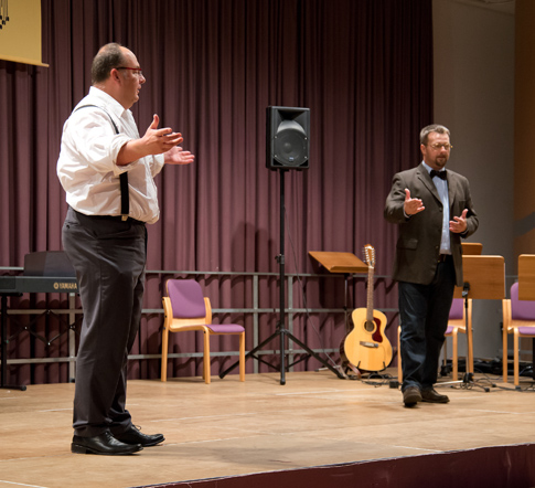 Heilgard Wagner trug "Die englische Inhaltsangabe" von Loriot vor, Eike Sunshine "Die Uhr von Loewe" von Karl Valentin. Beide besuchen die Klasse Sprecherziehung von Eva-Maria Shata-Aichner an der Landesmusikschule Puchenau.
